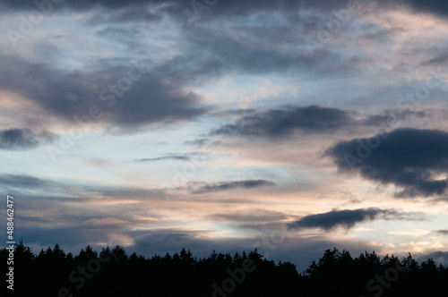 © Niko Troebst, Fototapeta premium Cloudy sky above silhouette spruce forest,plenty of copy space