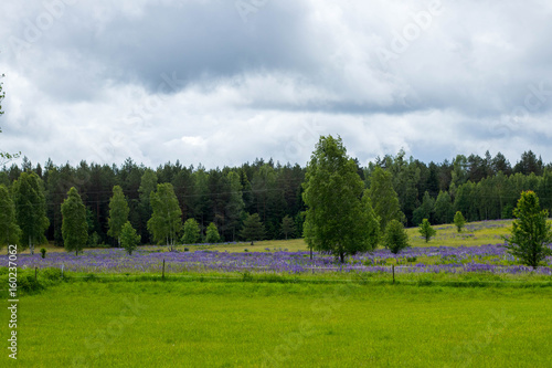 © Magdalena, Obraz premium cloudy sky against green field blue flowers and forest against
