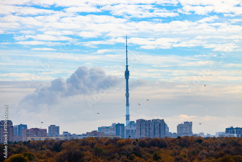 © vvoe, Naklejka premium cloudy sky, birds over city and park in autumn
