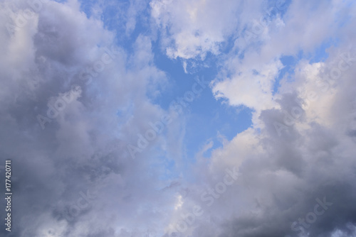 © Joeahead, Fototapeta premium Cloudy sky group with condensation in evening before sunset and raining.