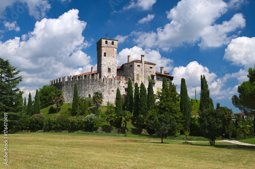 Fototapeta premium Cloudy sky in a sunny day over the medieval Villalta castle, Fagagna, Friuli,...