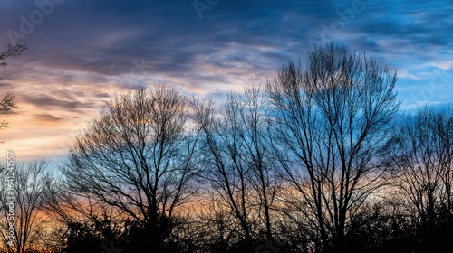 Fototapeta premium Cloudy Sky in Blue and Orange with Tree Silhouettes at Sunset – Indigo and...