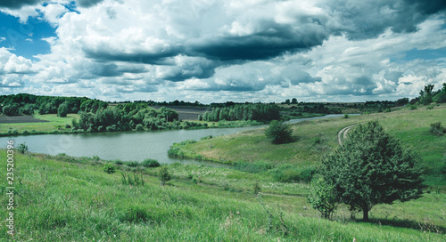 © valeriy boyarskiy, Obraz premium Cloudy summer landscape with small river.