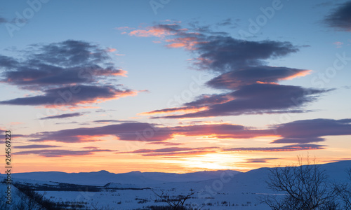 Fototapeta premium Cloudy sunset over Swedish Lapland on a winters day. Ahkka, Sweden.