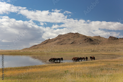 © vladimir kondrachov, Obraz premium Cloudy view on steppe and lake. Mongolia