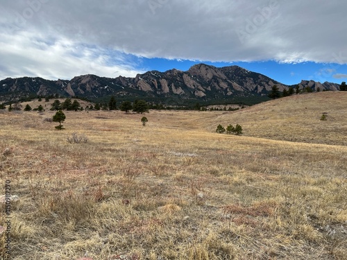 © Ted Iwabuchi Nature, Obraz premium Cloudy winter meadow and Flatirons, Boulder, Colorado,mountains,Rocky mountains