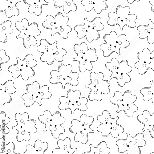 Fototapeta premium Clover, emoticons, emoji. Characters St. Patricks day. Seamless pattern for coloring book. Black and white illustration.