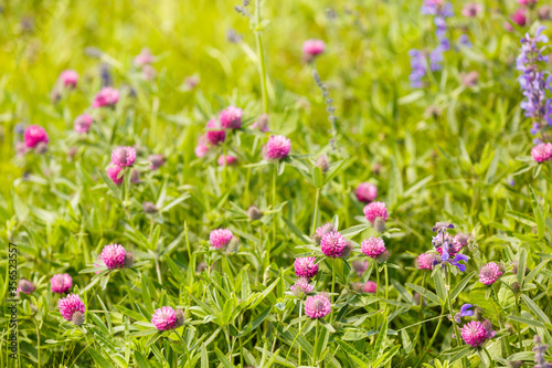 © Angelov, Obraz premium Clover field,trees and stormy sky.