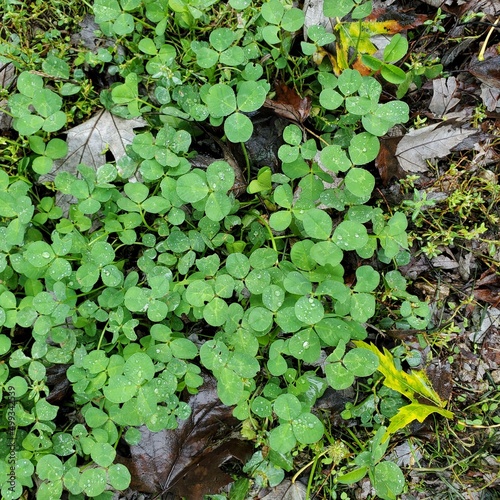 © Monica, Obraz premium clover patch on ground with brown leaves