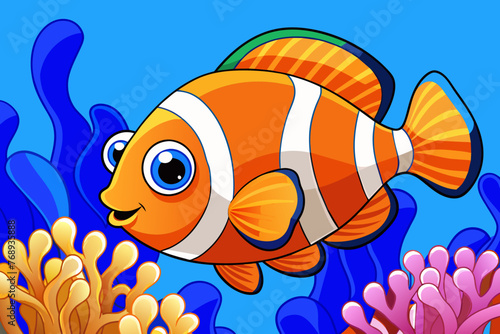 Fototapeta premium clown-fish-in-a-blue-sea-water-surrounded-by-coral. vector illustration