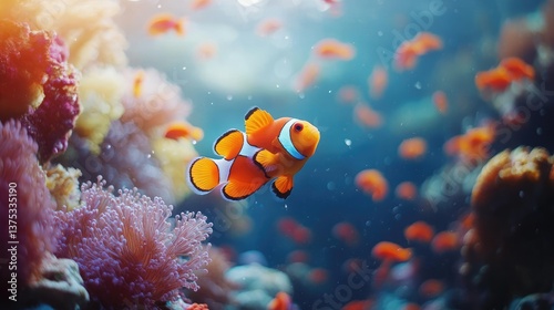 © NIAZ, Fototapeta premium Clown fish swimming in an aquarium, adding color and life to the scene.