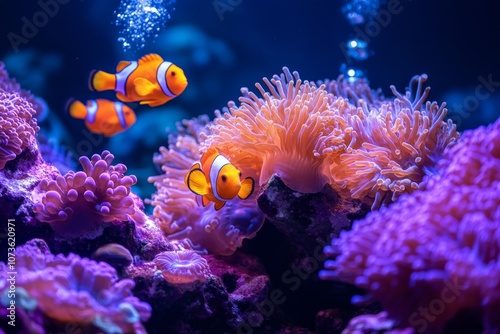 Fototapeta premium Clownfish Swimming in Coral Reef with Bubbles