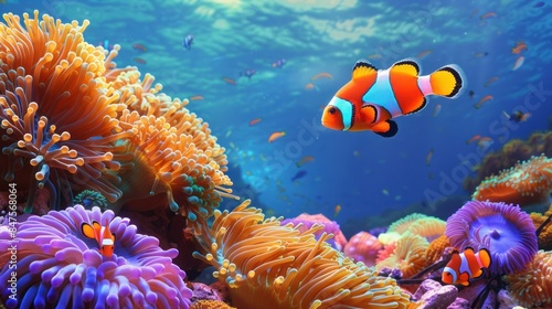 Fototapeta premium Clownfish swimming on anemone underwater coral reef background. colorful...