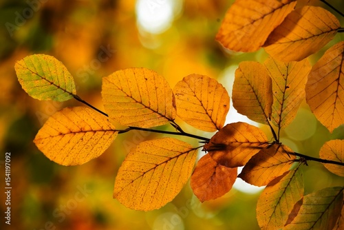 Fototapeta premium Cluster of autumn leaves is glowing on slender branch in flat design, creamy bokeh background