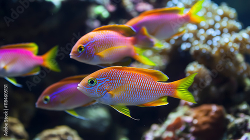 Fototapeta premium Cluster of colorful tropical fish in a vibrant coral reef, showcasing marine...