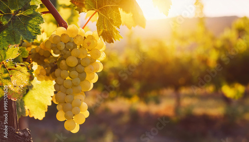 © hardvicore, Fototapeta premium Cluster of fresh ripe grape in vineyard. Organic farm product. Natural harvest. Soft sunset light.