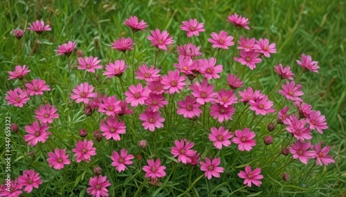 Fototapeta premium Cluster of pink wildflowers blooming in green grass, floral, closeup, pretty