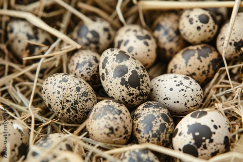 © Viktor, Obraz premium Cluster of quail eggs in nest among stalks. AI generated