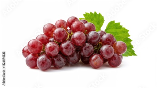 © Lasvu, Obraz premium Cluster of red grapes with green leaves. Fresh fruit, healthy snack, natural, juicy, and sweet.