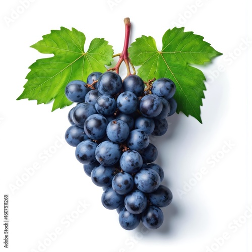© Lubov, Fototapeta premium Cluster of ripe purple grapes with green stems and small white seeds. Each grape is round and attached to a stem with small leaves. Grapes suspended in white background.