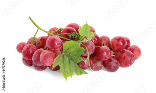 Fototapeta premium Cluster of ripe red grapes with green leaves on white background