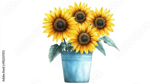 © Ndoomyim, Obraz premium Cluster of Sunflowers in Blue Pot Isolated