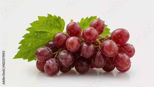 © VirtualVista, Fototapeta premium Cluster of tiny red table grapes with wet grape leaves on a plain background