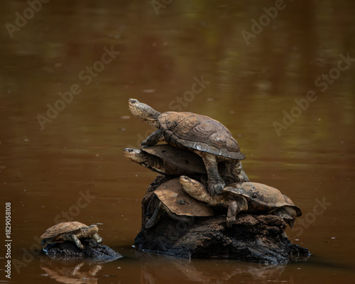 © Robert, Obraz premium Cluster of turtles resting on a partially submerged log in brown, still water, with one turtle climbing and another approaching from the side. This peaceful yet dynamic wildlife scene showcases