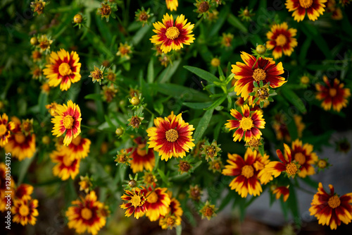 © Cavan, Fototapeta premium Cluster of vibrant yellow and red coreopsis flowers in full bloom