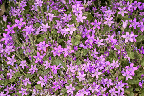 Naklejka premium Cluster of violet colored small flowers on a Campanula Portenschlagiana plant.