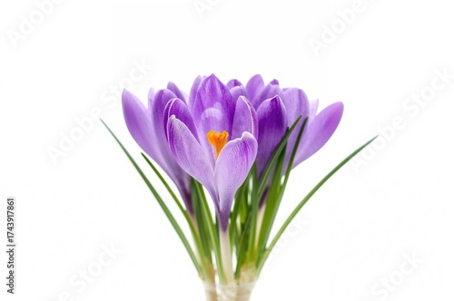 Fototapeta premium Cluster of violet crocus flowers set against a plain white backdrop