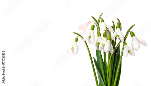 Fototapeta premium Cluster of white snowdrop flowers with green stems against a stark black...