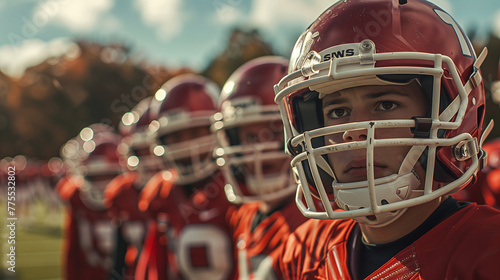 © Aekawat, Fototapeta premium Cluster of youthful American football athletes standing in unison on a field