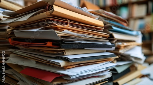 © Good moose, Obraz premium Cluttered stack of documents in an office setting.