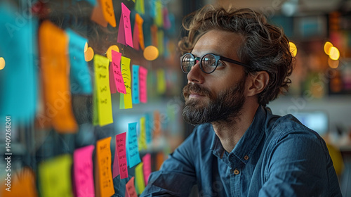 Obraz premium Co-Founder Creating Growth Hacking Funnel With Sticky Notes On Glass Board,...