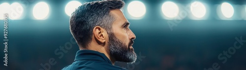 © JAKE STUDIO, Fototapeta premium Coach leading an intense training drill under stadium lights during evening practice Football coaching, game preparation, sports training