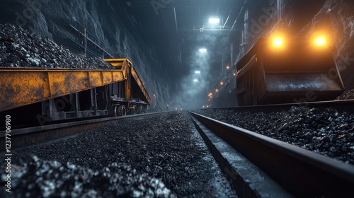 © NAIMAH, Obraz premium Coal mine train transporting ore through dimly lit tunnel