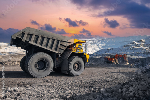 Obraz premium Coal mining, Open pit mine work in winter landscape with yellow dump truck and excavator