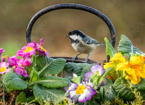 Naklejka premium Coal tit bird perched on an old antique teapot with colourful primroses in the spring