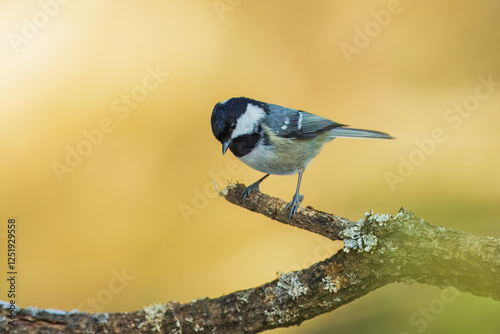 © Miroslav Srb, Obraz premium Coal tit (Periparus ater) perched on on a branch, Impressive clean nature background in sunset.