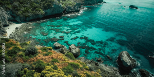 © Landscape Planet, Fototapeta premium Coast as a background from above. Turquoise background with top view. Summer seascape from the air. Nusa Penida Island, Indonesia. Travel. Generative Ai