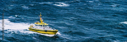 © Maridav, Obraz premium Coast guard boat patrol riding on rough sea waves in Alaska. Panoramic banner background.