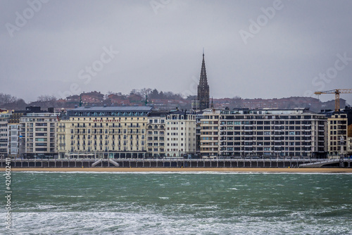 Naklejka premium Coast in San Sebastian, view with cathedral tower, Spain