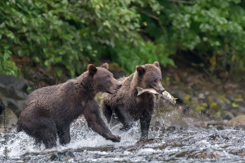 © Kirk Hewlett, Fototapeta premium Coastal Brown (Grizzly) Bear (Ursus arctos) running through an river carrying a salmon with another bear running alongside.