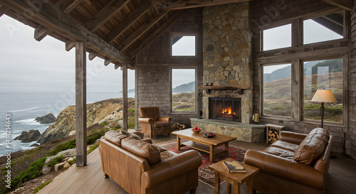 Fototapeta premium Coastal Cabin Living Room: Rustic Elegance with Ocean Views