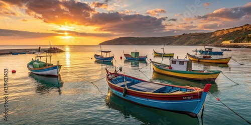 © nick, Naklejka premium Coastal calm at sunset: a picturesque seascape featuring colorful fishing boats. Travel photography perfection.