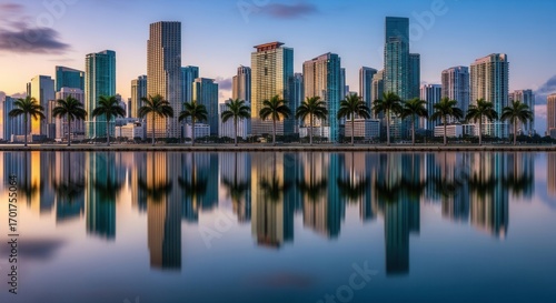 © Terri, Naklejka premium Coastal city skyline at sunset with numerous buildings palm trees and vivid reflections in calm water
