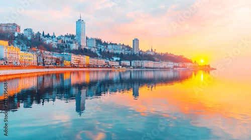 © TBC, Fototapeta premium Coastal city sunrise, buildings reflected in calm water, travel postcard