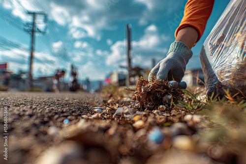 © Ikram, Obraz premium Coastal cleanup volunteer removes debris near road