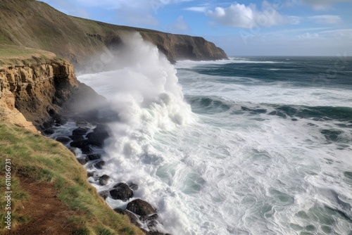 Obraz premium coastal cliff view with crashing waves and foam on the shore, created with...